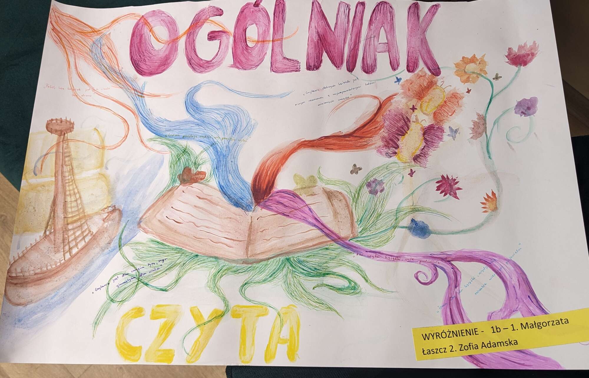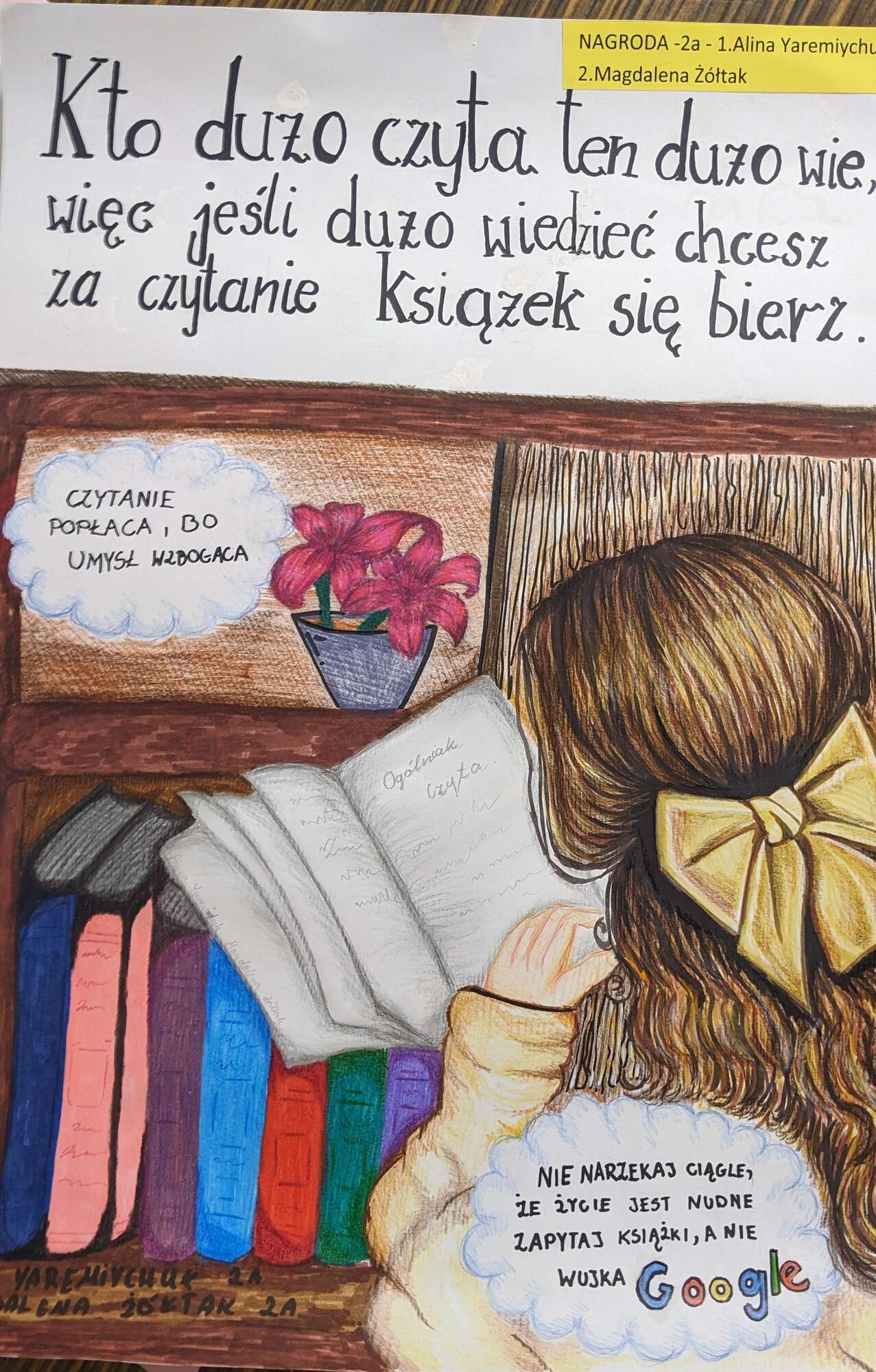 Podsumowaliśmy również projekt na plakat reklamujący czytelnictwo. Hasło akcji brzmiało „Ogólniak czyta” i zostało zrealizowane na lekcjach biznesu i zarządzania w klasach pierwszych i drugich. 33 uczniom udało się zwrócić uwagę komisji na swoje prace. Główne kryteria brane przy ocenie to: pomysł i kreatywność w podejściu do tematu, technika oraz precyzja wykonania. Jury przyznało trzy równorzędne nagrody główne i siedem wyróżnień.